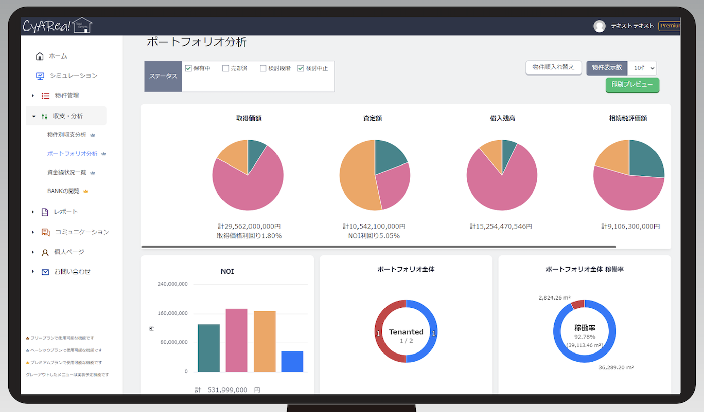各物件に設定した「ステータス(保有中・売却済み・検討段階・検討中止)」より、さらに個別物件へフォーカスすることもでき、各物件の位置付けを整理することで、今後売却を視野に入れるべき物件や、補強していきたい物件の性格などを把握できます。