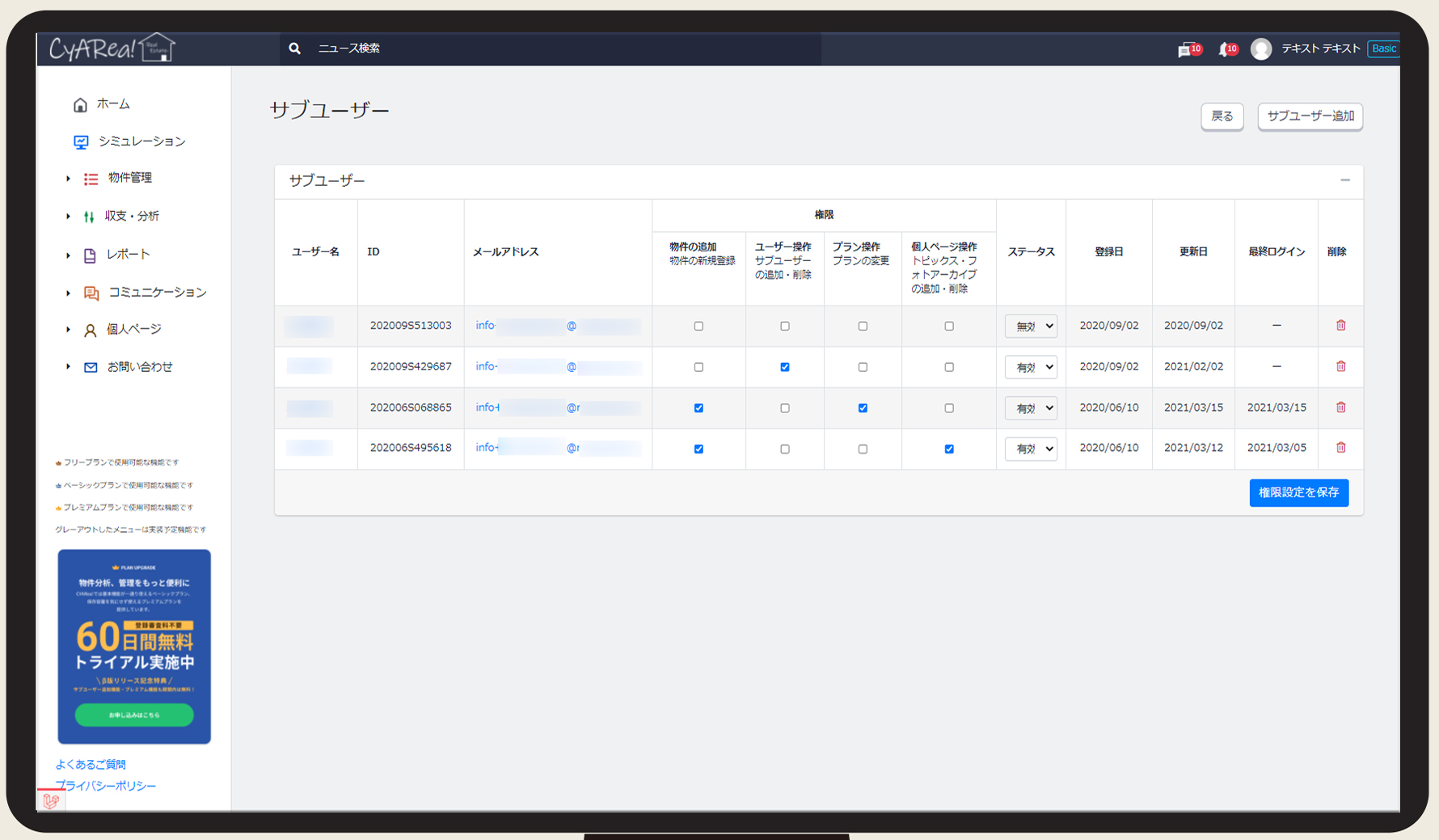 サブアカウントの作成・利用[権限・ステータス等の管理]
